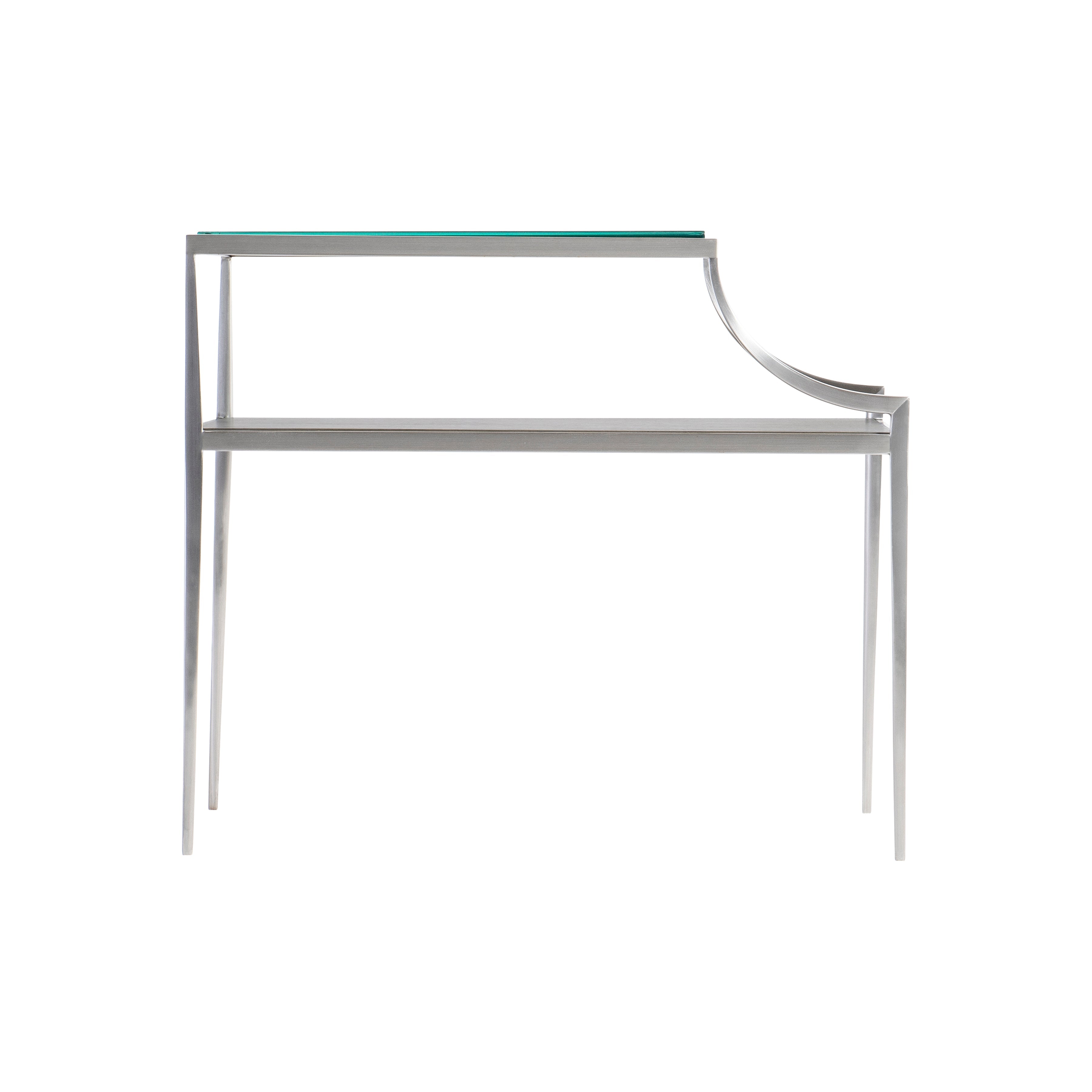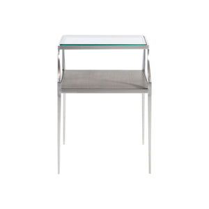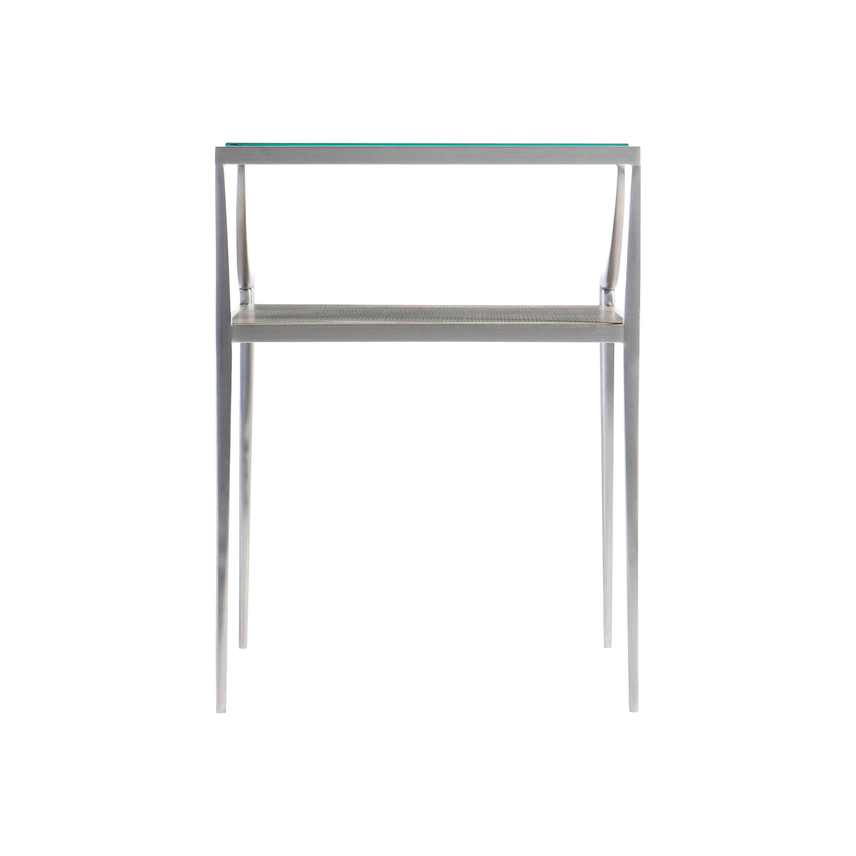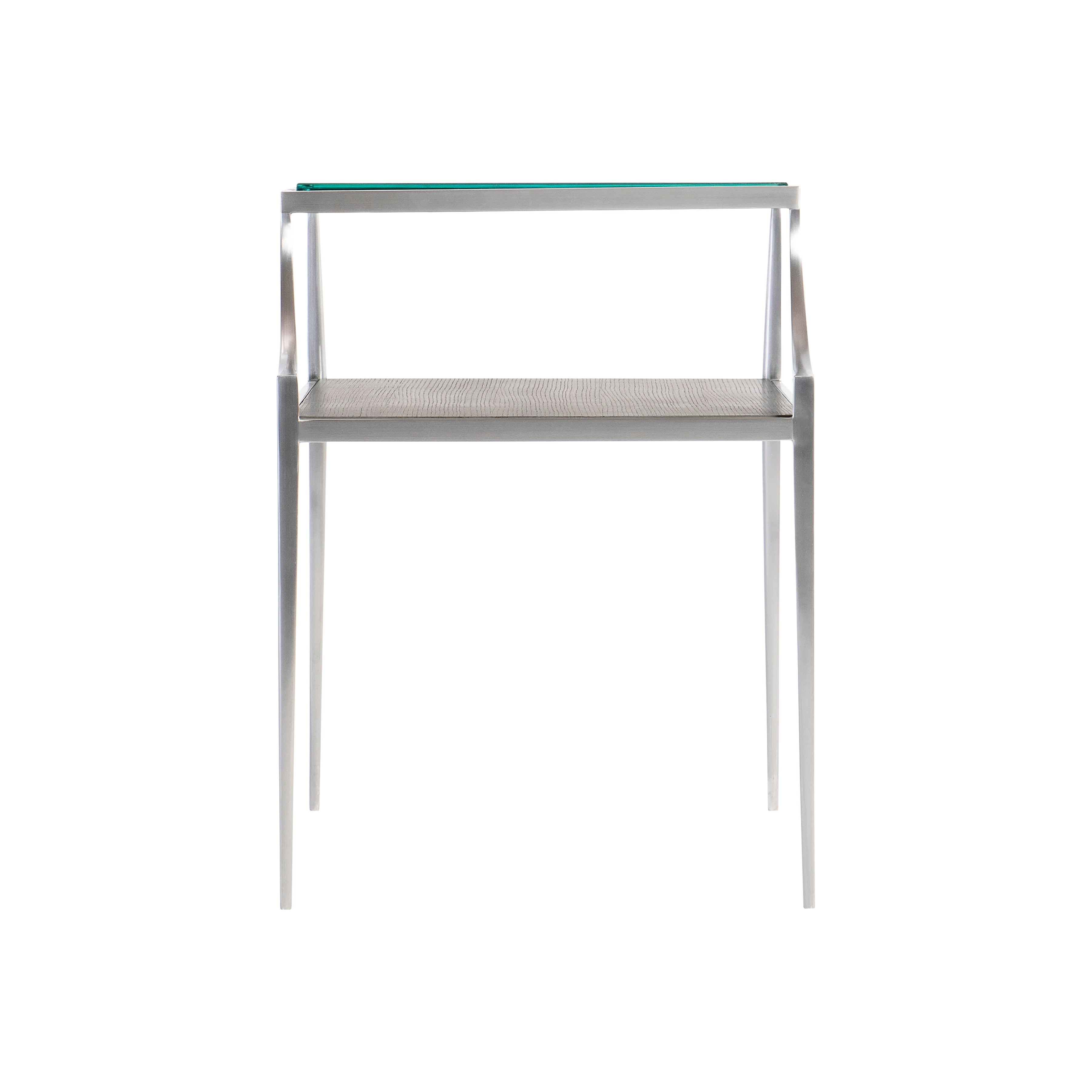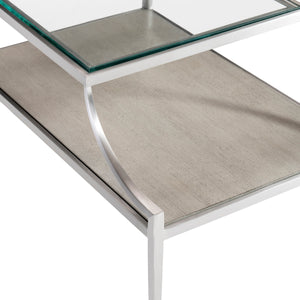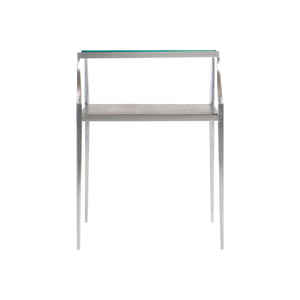 Metal frame in Brushed Stainless Steel finish with tempered, polished-edge glass top and one wood shelf in Nebbia finishAdjustable glidesSpecifications subject to change without notice