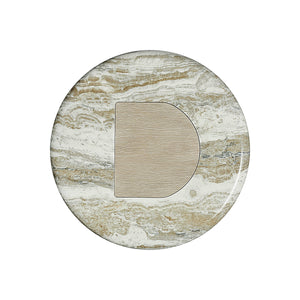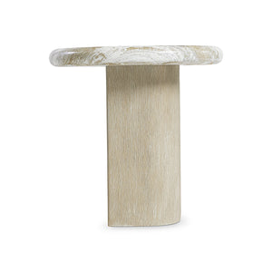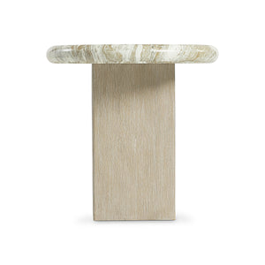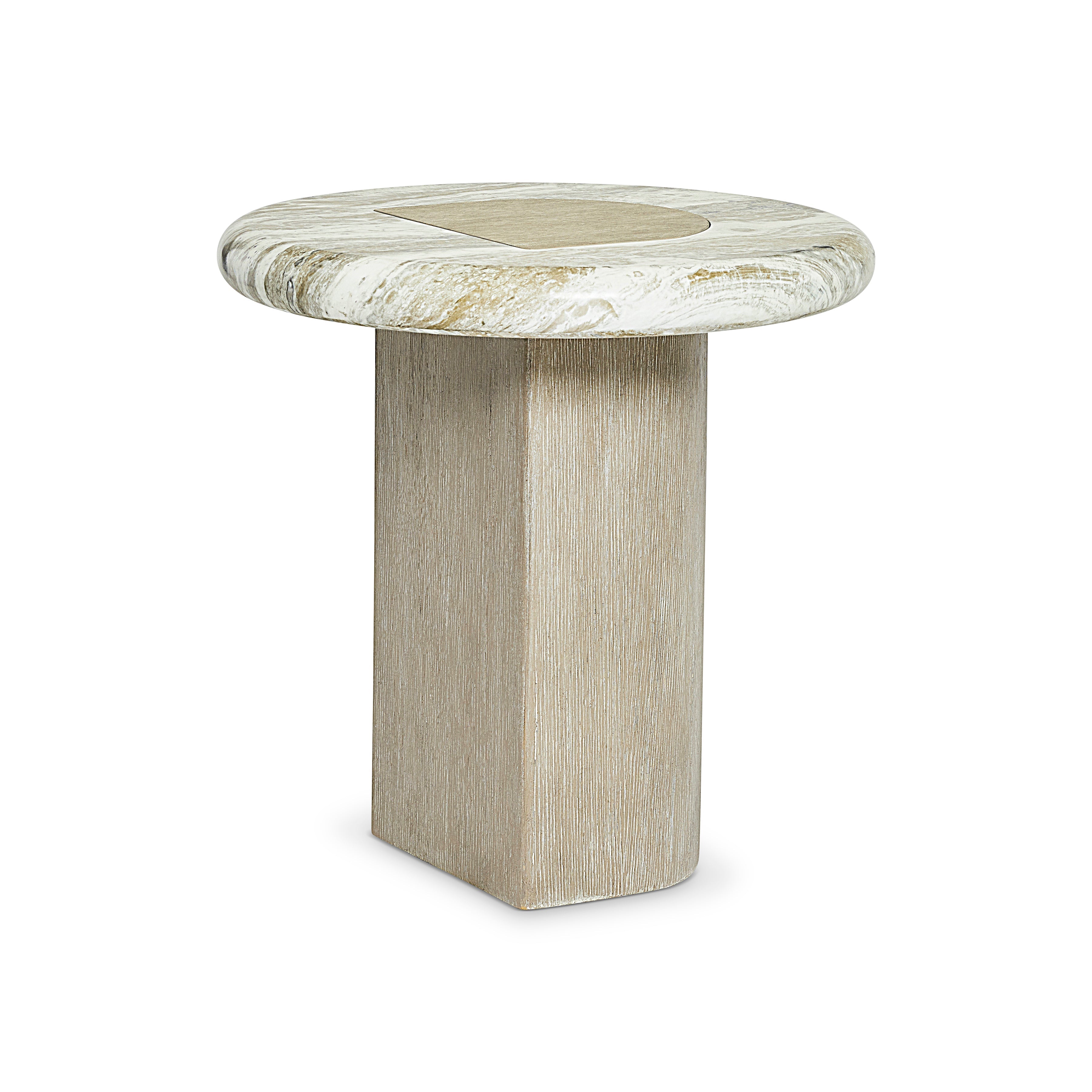 Base crafted from quartered oak veneers in Clay finish below bullnose-edge faux stone top in Kalta finishTop of base is visible in middle of tabletopAdjustable glidesSpecifications subject to change without notice