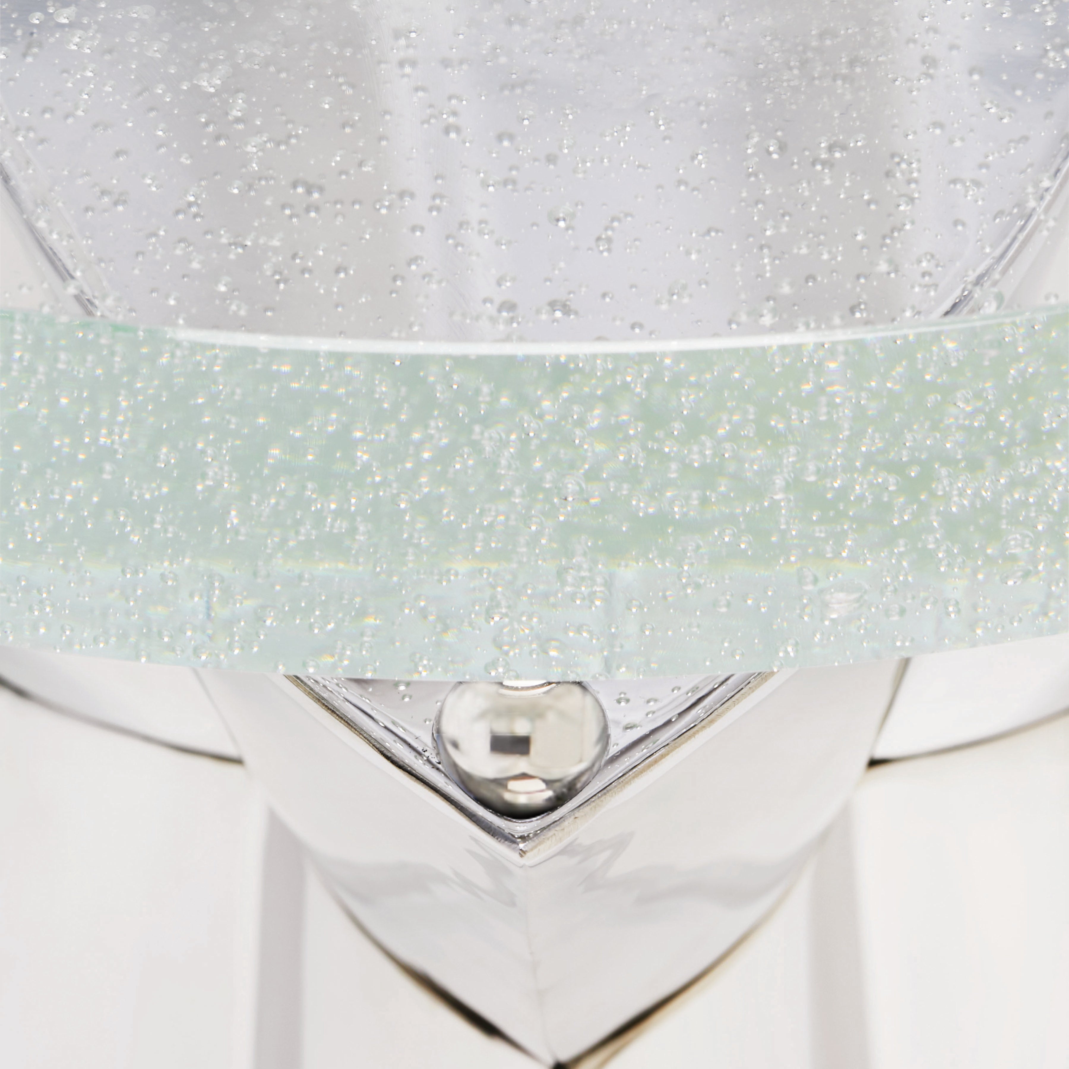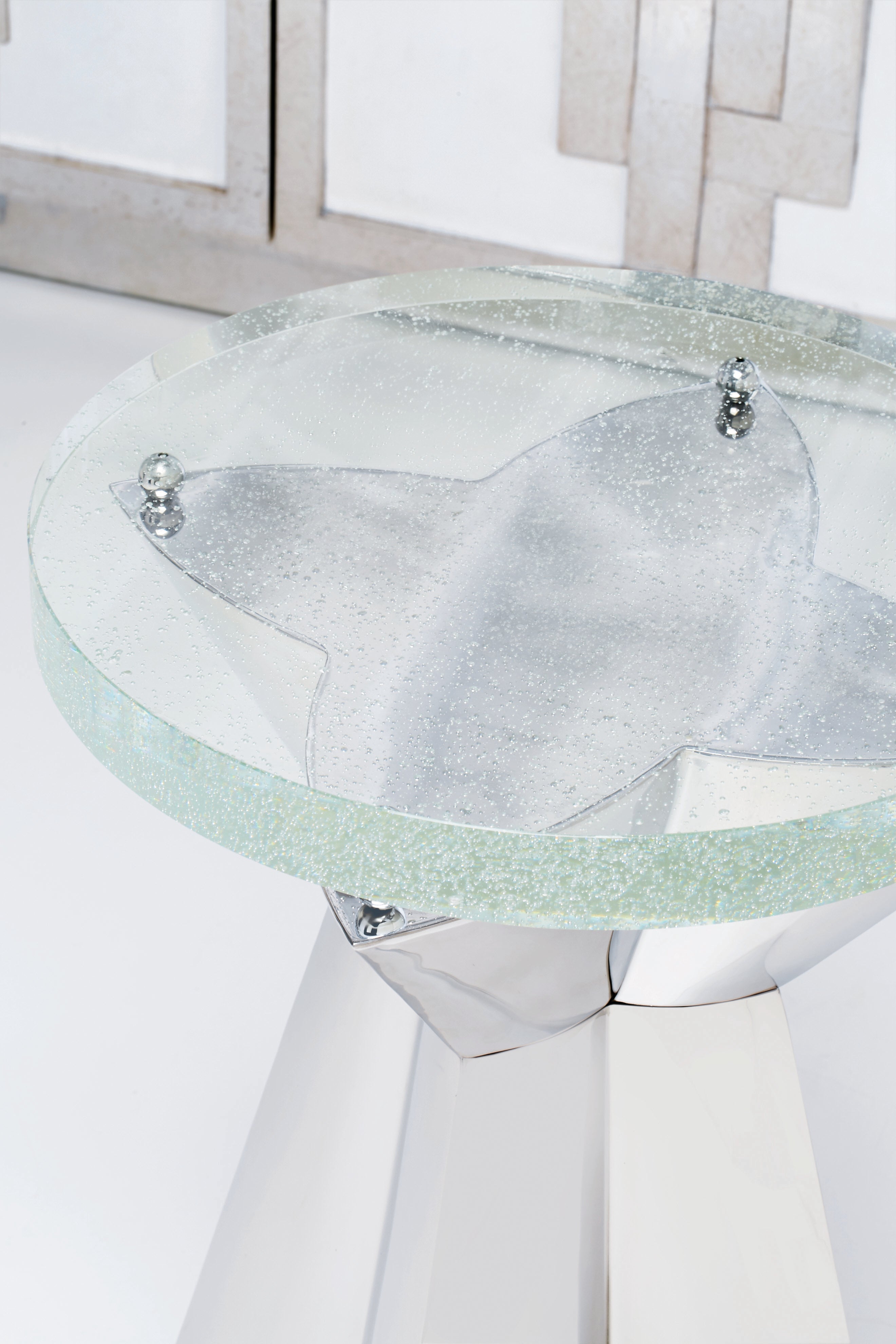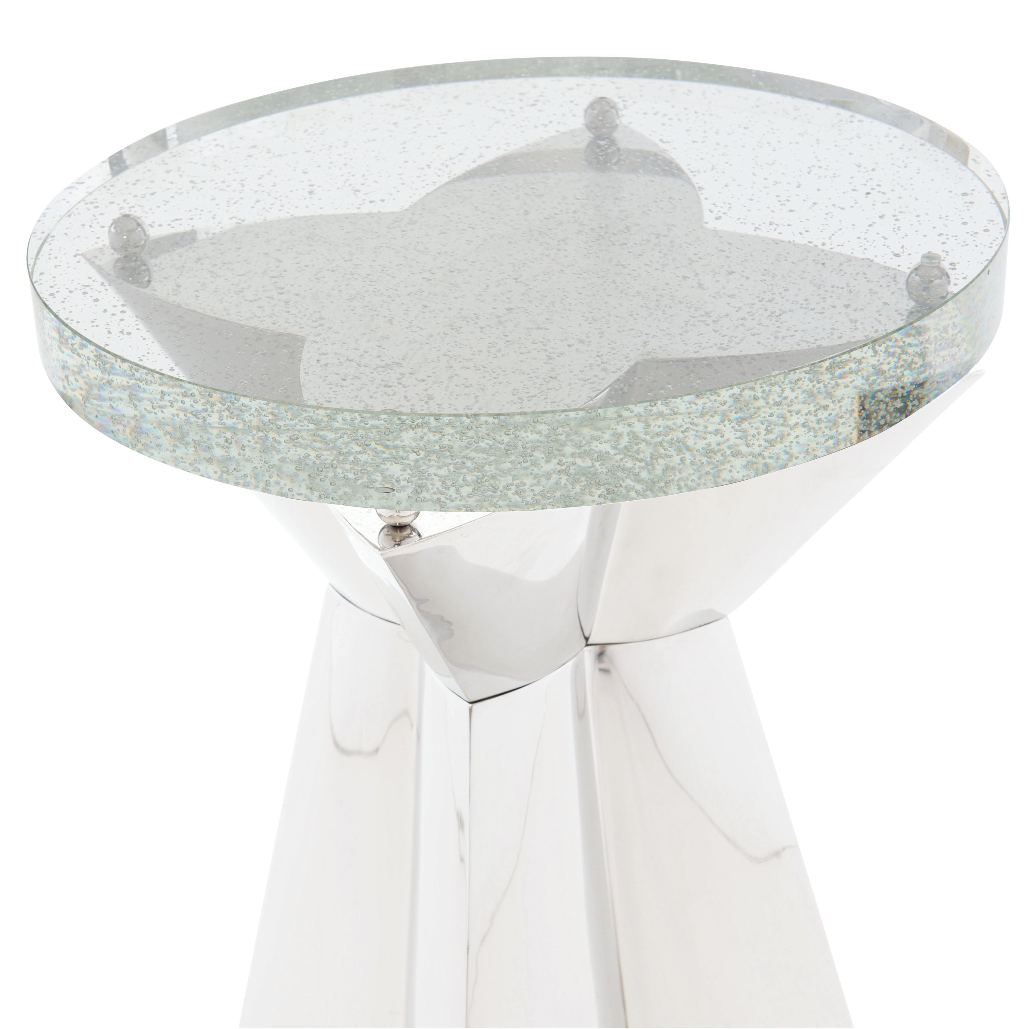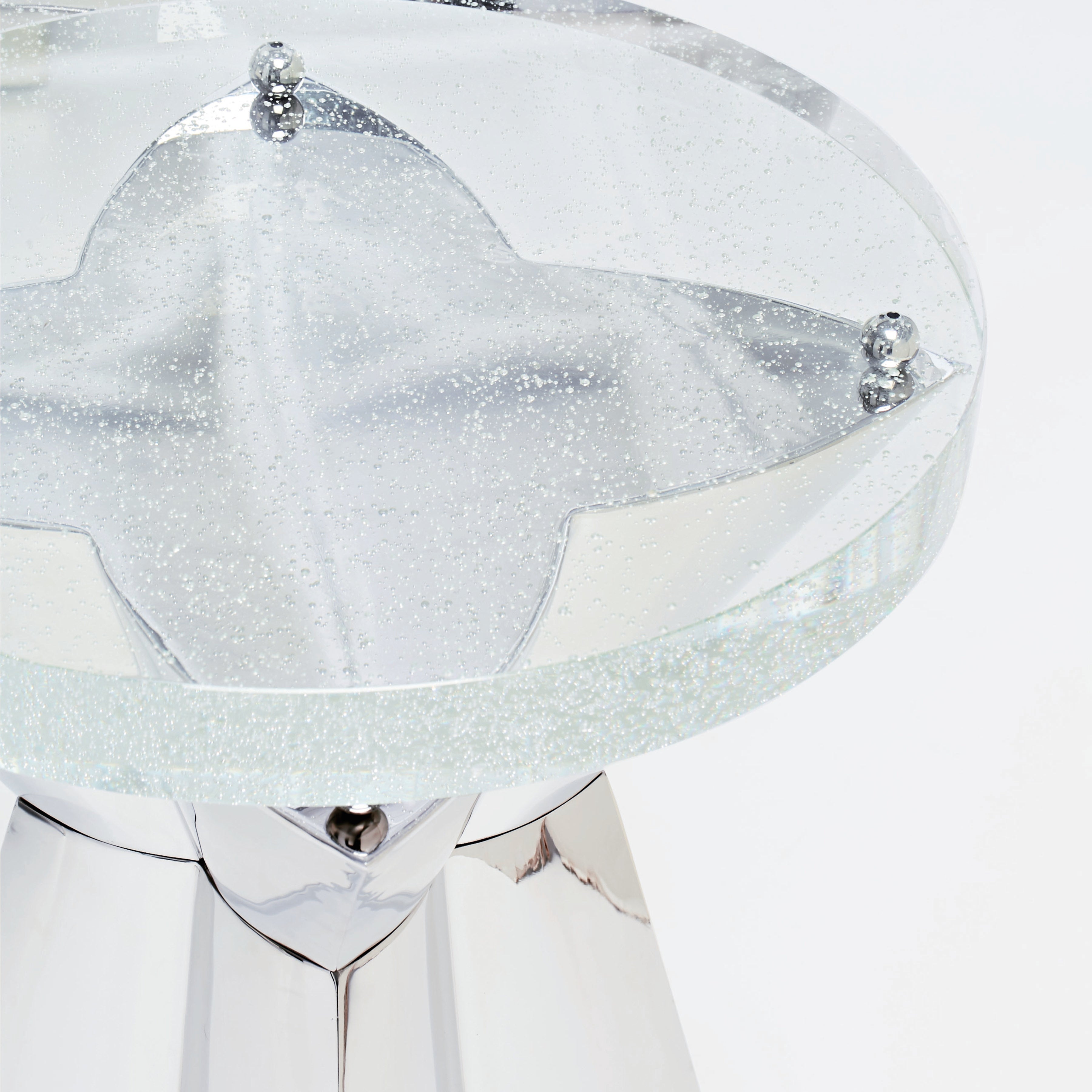 Bubble glass top.Polished stainless steel base with metal ball supports for glass top.Adjustable glides.Note: Pop-in glass bumpers included (Height dimensions included bumpers).