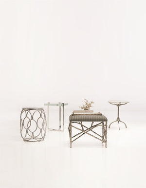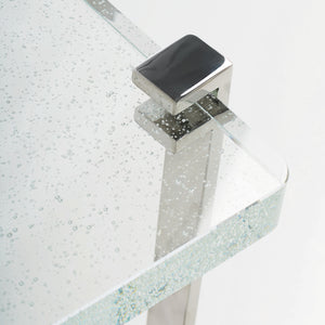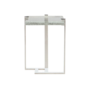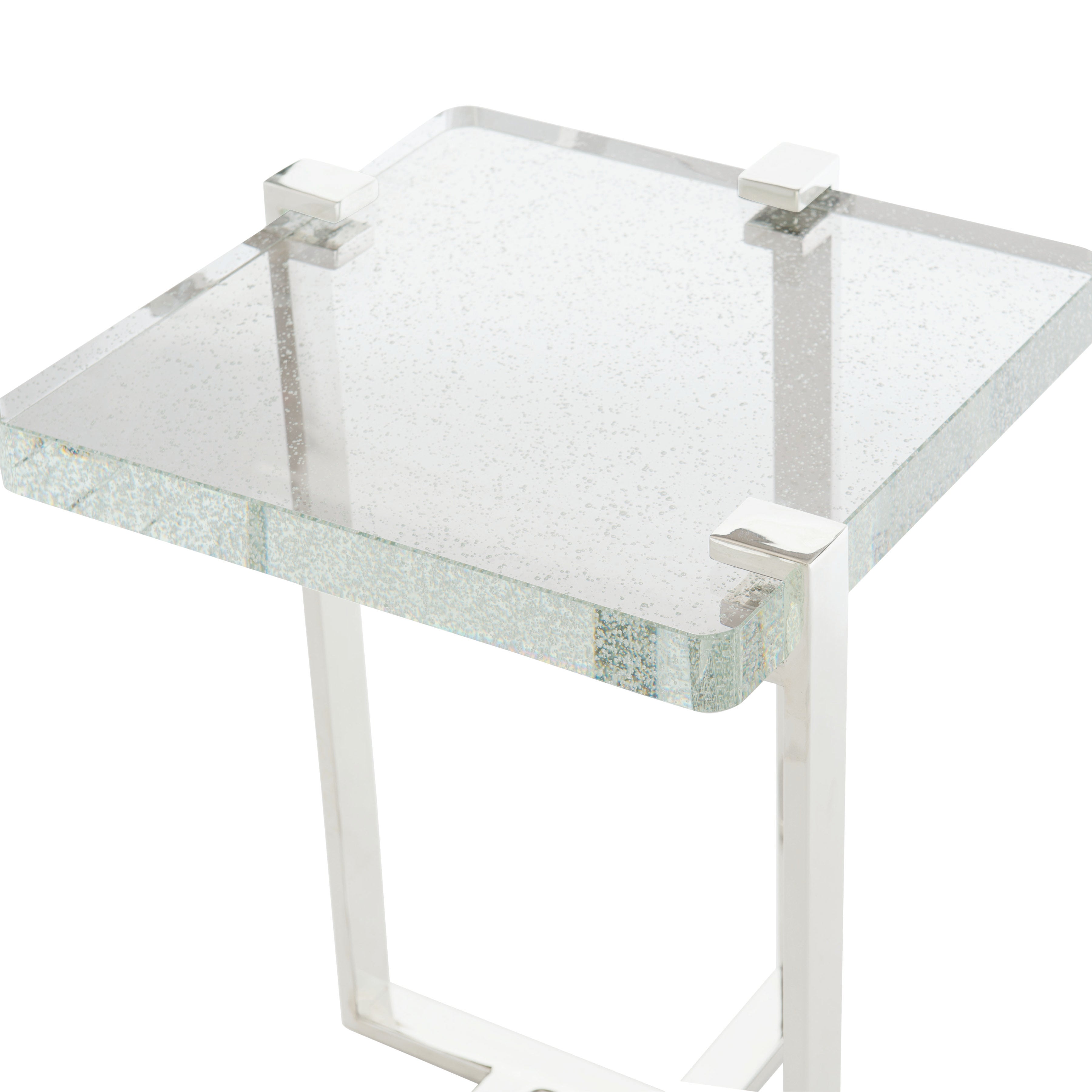 Square accent table.Bubble glass top.Tubular polished stainless steel base.Adjustable glides.