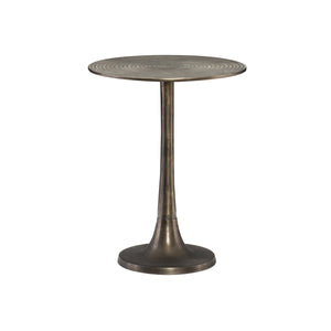 Round cast aluminum table.Pedestal base.Chiseled Antique Brass finish.Note: Felt bottom for floor protection.