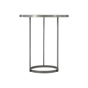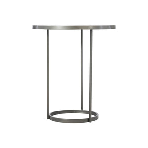 Round side table.Cast aluminum top covered with Grey baked enamel finish.Cast aluminum base in Graphite finish.Adjustable glides.