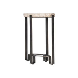Oval shaped accent table.Laminated White Travertine stone top with chiseled edge.Solid steel base in oil-rubbed bronze finish.Adjustable glides.