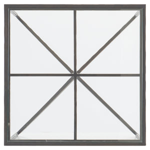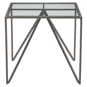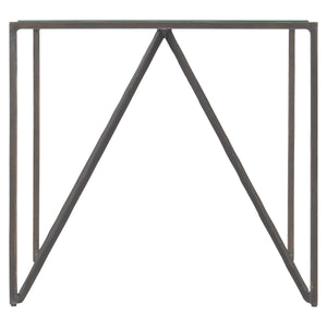 Square iron side table and stretchers with lightly hammered texture.New Aged Bronze finish.Inset tempered glass top.Small adjustable glides.