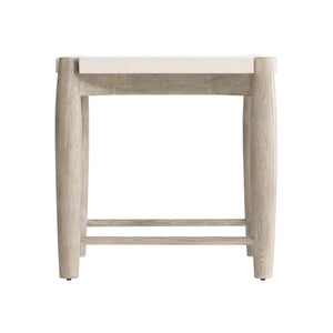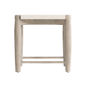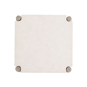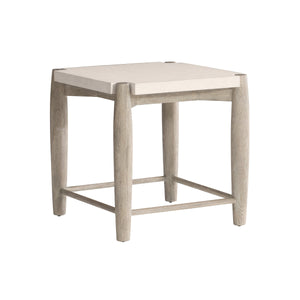 Side table top of MDF with Vellum finish and scooped out corners.Weathered Greige finish on sandblasted ash base with round legs and stretchers.Four round legs.Adjustable glides.