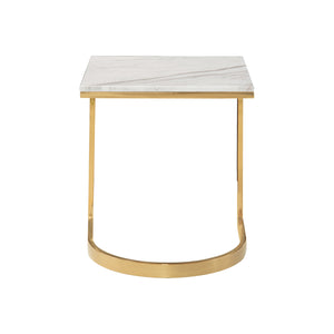 Jazz White marble top.Tubular Steel base in Polished Brass finish.Adjustable glides.Stretchers.