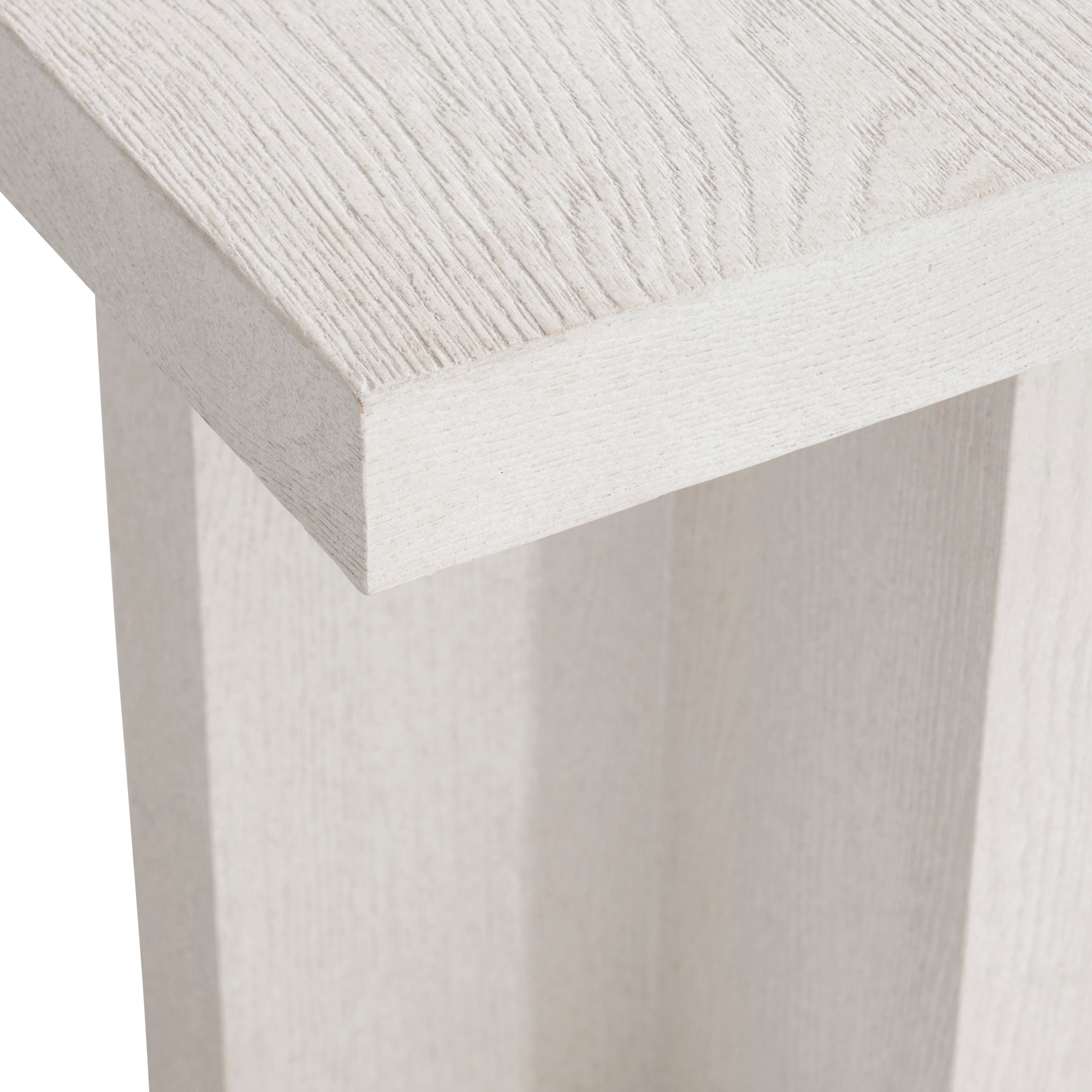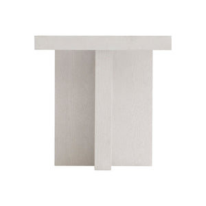 Square side table.Sandblasted White finish.Center base with two leg panels intersecting in the center to form a cross-shaped base.Adjustable glides.
