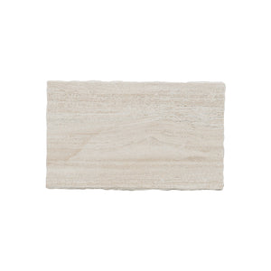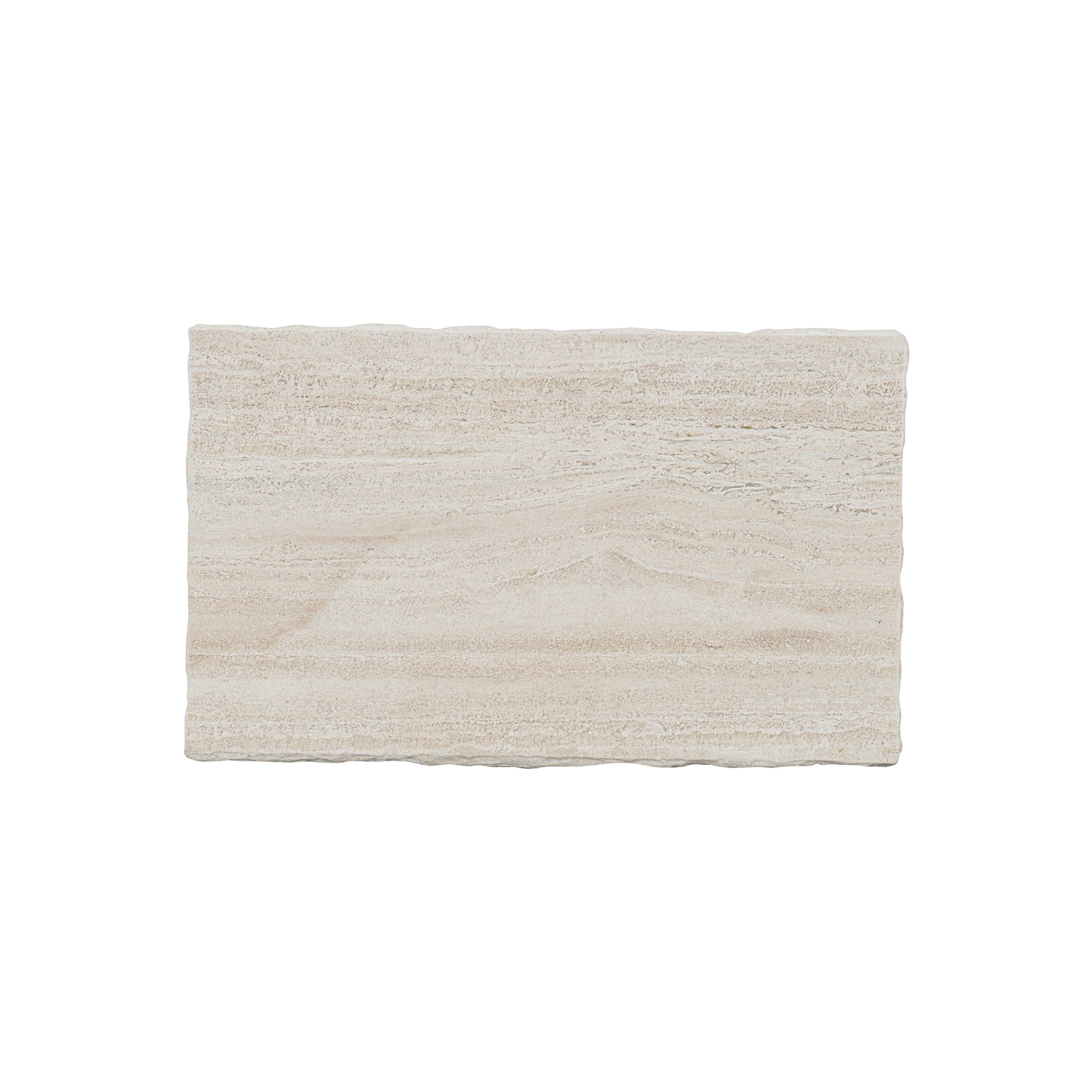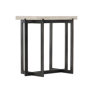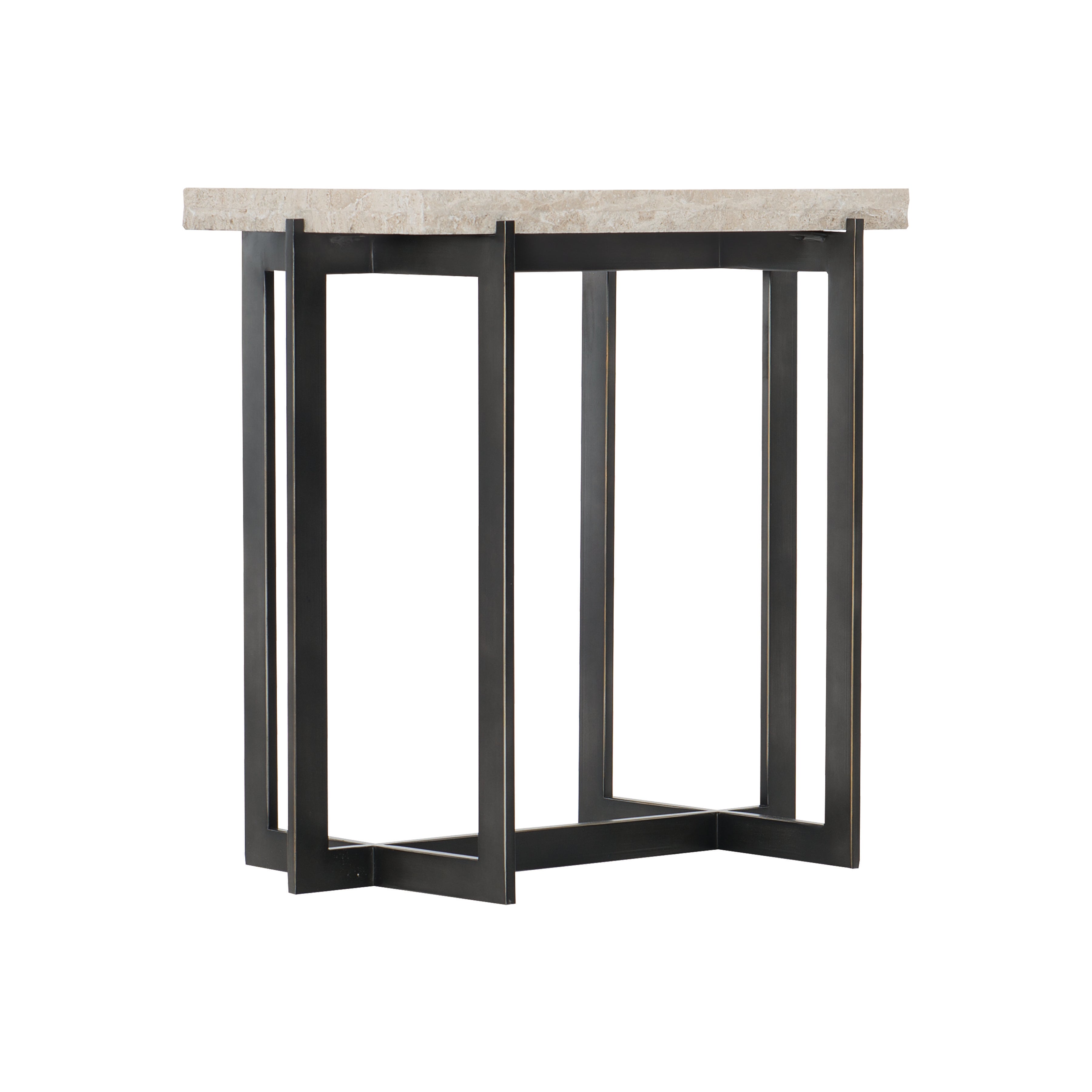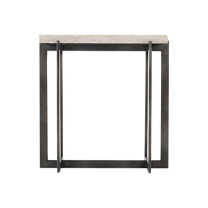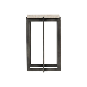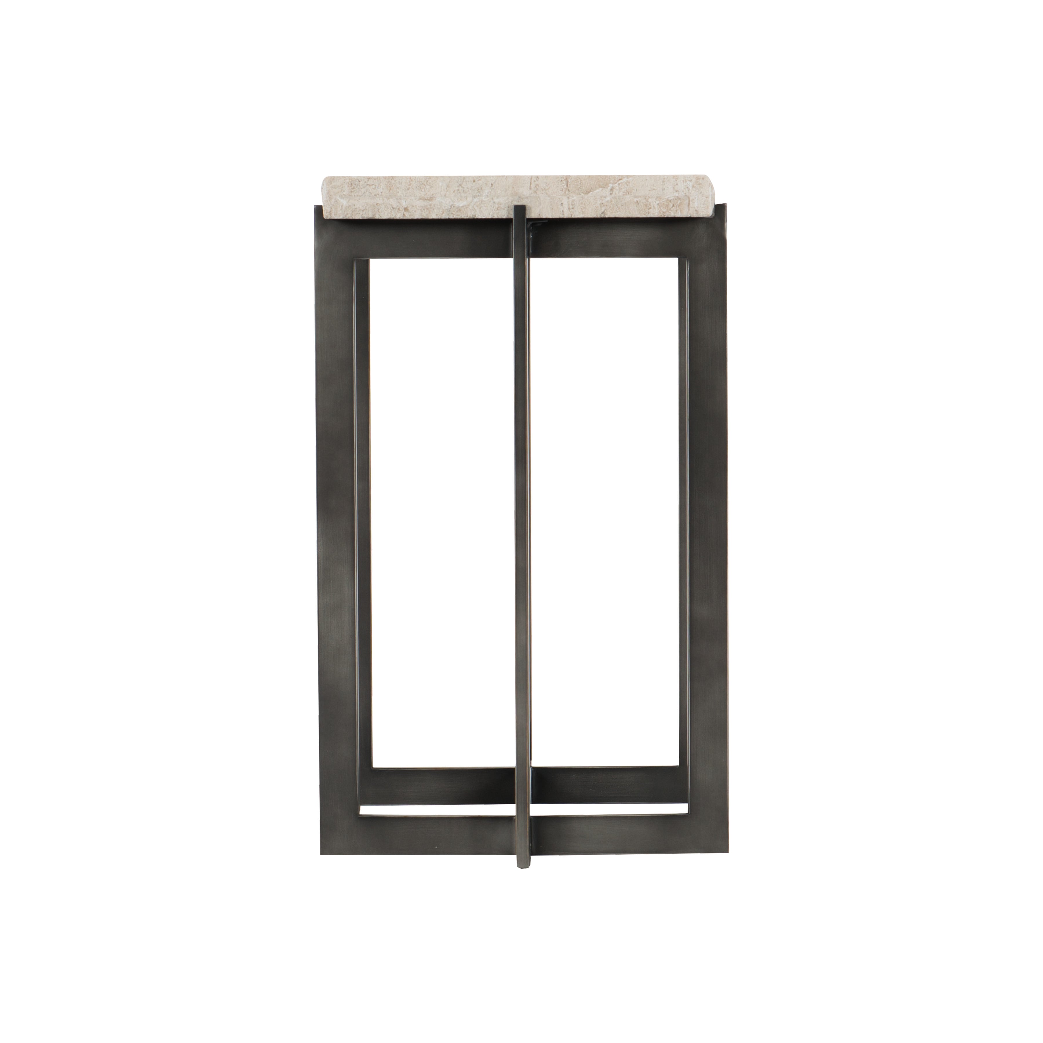 Rectangular side table.Laminated White Travertine stone top.Tubular steel base in oil-rubbed Bronze finish.Adjustable glides.