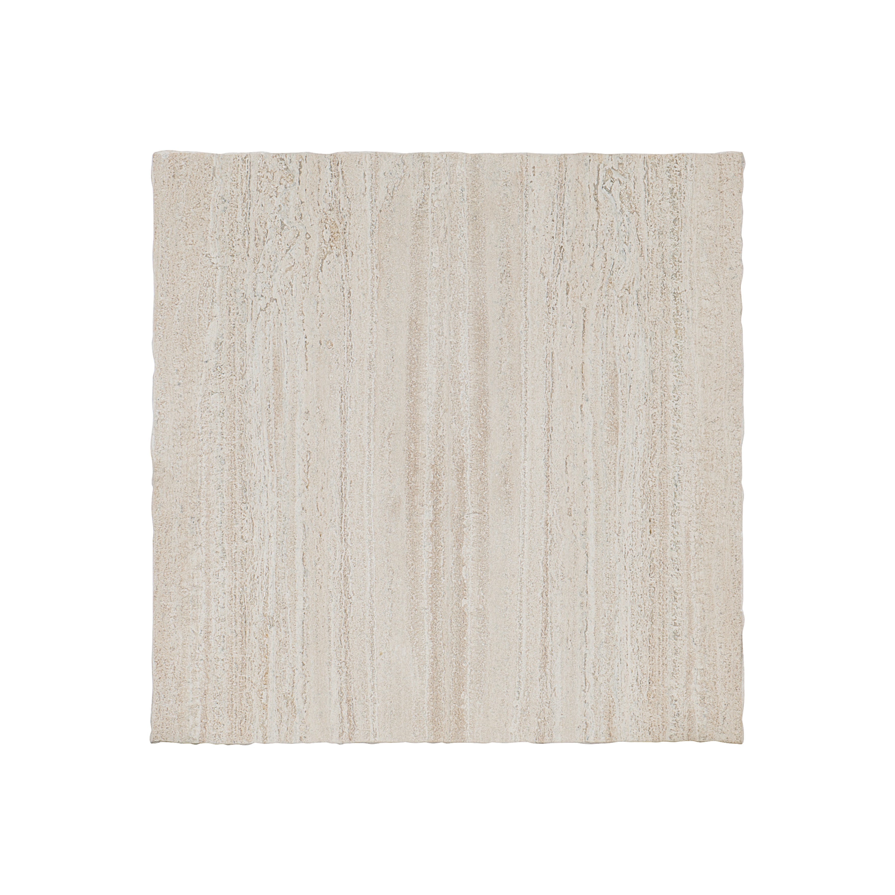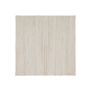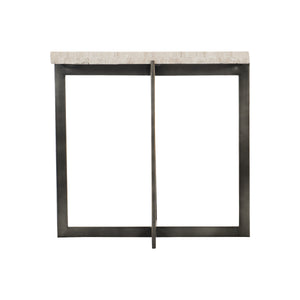 Square side table.Laminated White Travertine stone top.Tubular steel base in oil-rubbed Bronze finish.Adjustable glides.