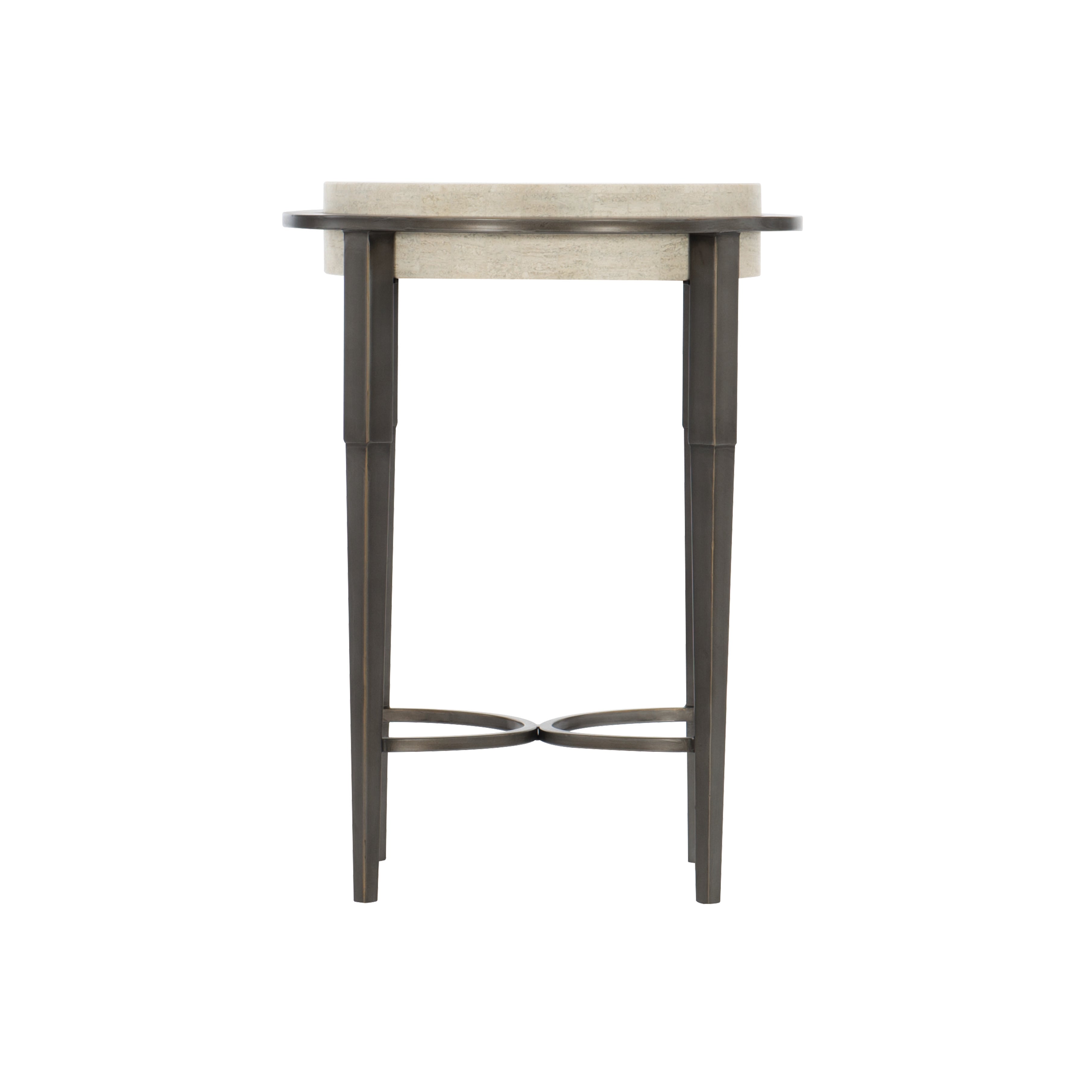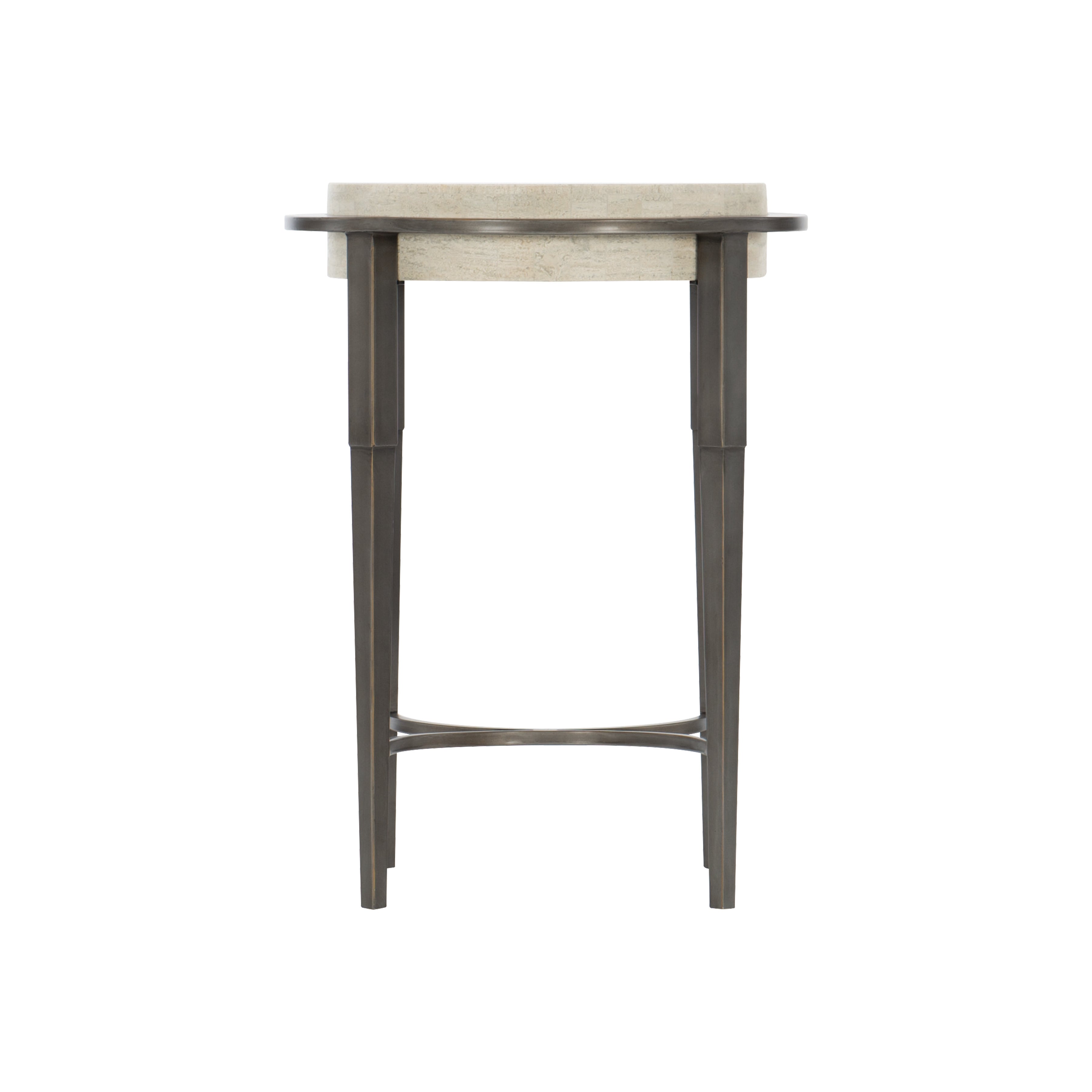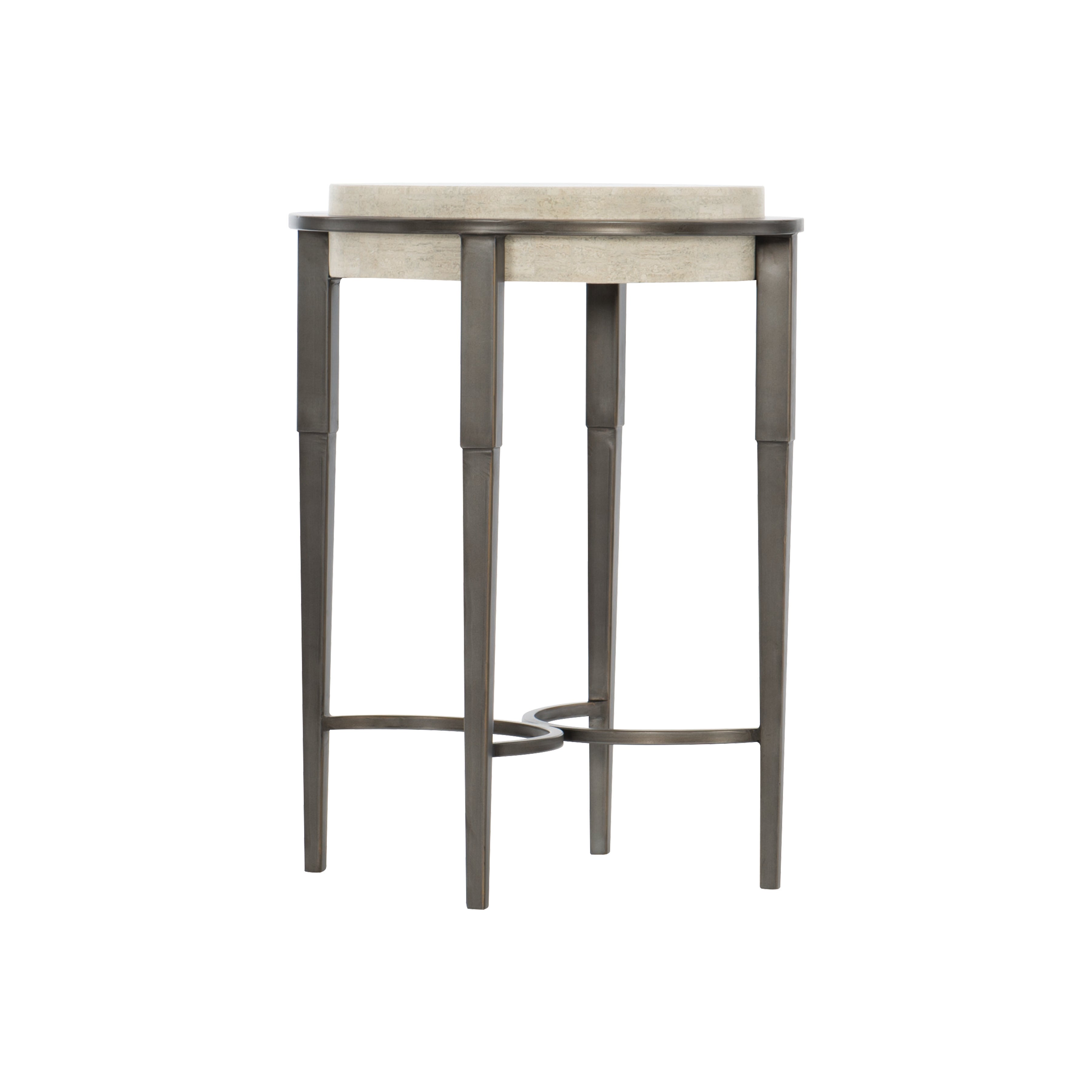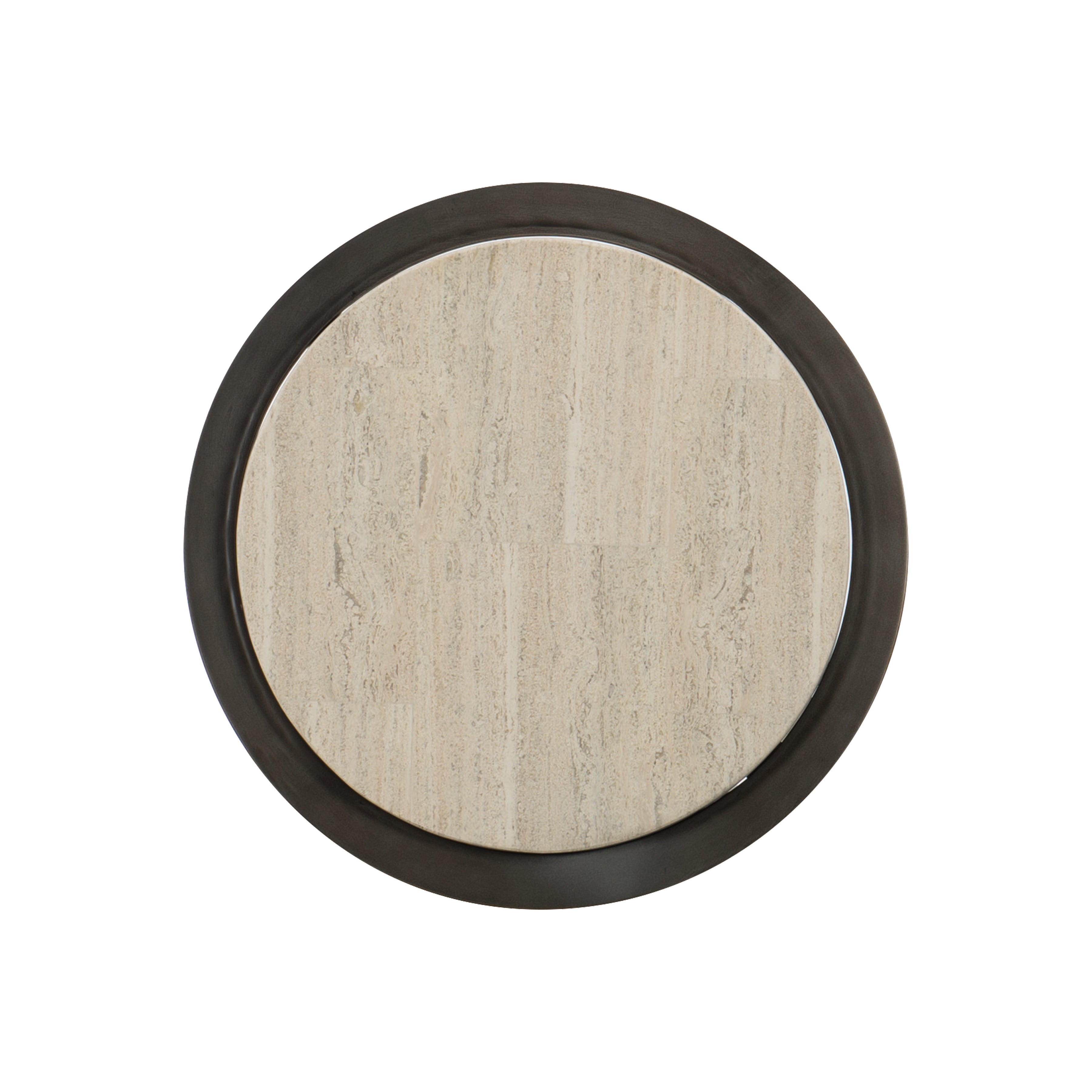Inset honed White Travertine stone top (unsealed).Plated steel base.Antique Pewter finish.Adjustable glides.