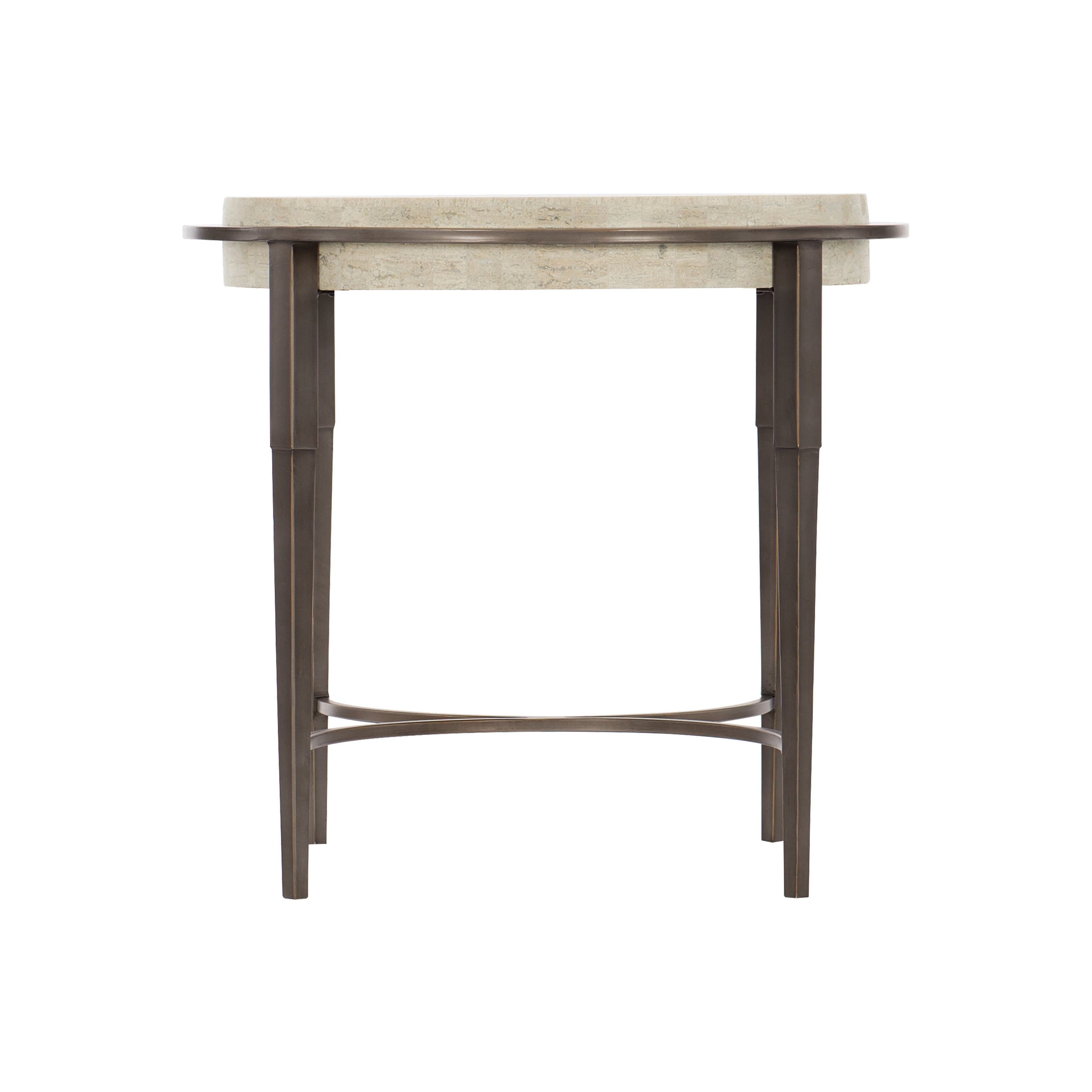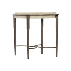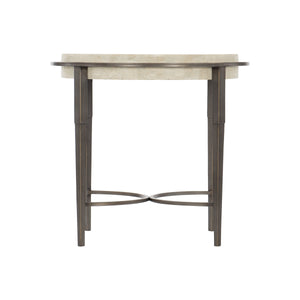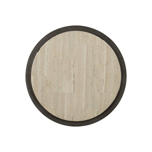 Round side table.Inset honed White Travertine stone top (unsealed).Plated steel base and stretchers in Antique Pewter finish.Adjustable glides.