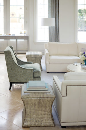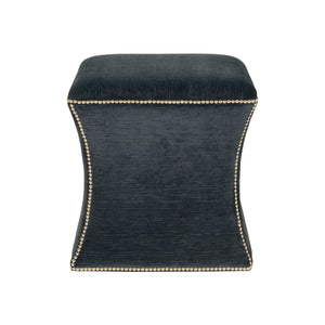 Inward curved ottoman.Nailhead trim on contours.Wood board construction.