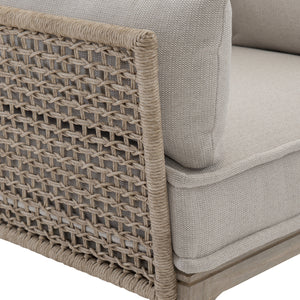 Twisted Abaca all Weather Wicker in Hazelnut finish.Teak wood in Sun Washed finish.Powder-coated aluminum.