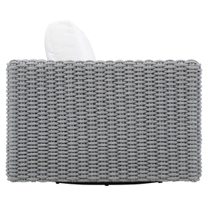 Woven rope in Grey Mist finishAluminum legs in Raven finishExteriors Plush cushions with deluxe faux down topperBox-edge fiber back pillowsOutdoor performance fabric