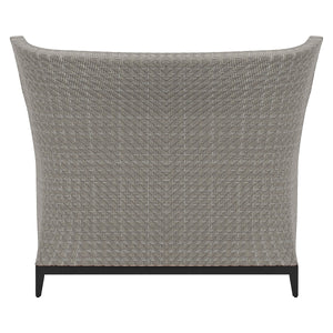 Powder-coated aluminum frame covered in herringbone weave All-Weather Wicker in Pewter Grey finishAluminum base in Graphite finishExteriors Plush seat cushion with deluxe faux down topperKnife-edge fiber back pillowsOutdoor performance fabric