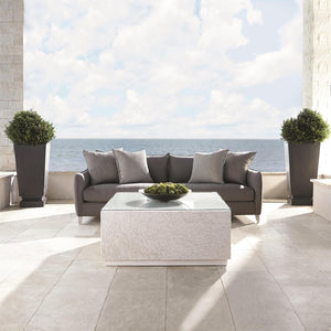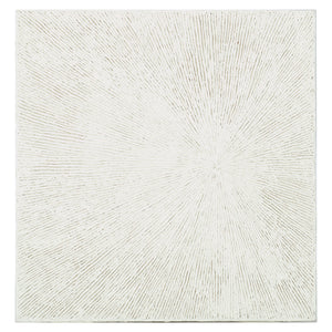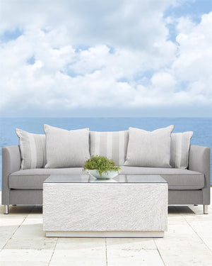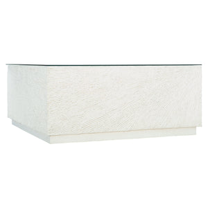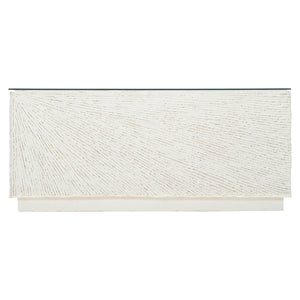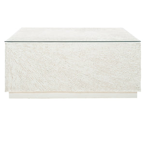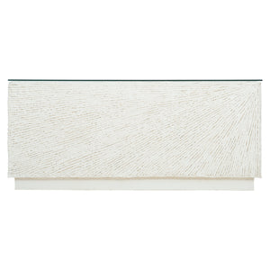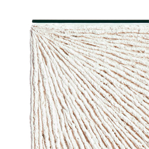 Lay-on tempered glass top with polished edge.Natural stonecast with polyurethane protective top coat in White finish with coco twig pattern on top and sides.Adjustable glides.Note: Glass bumpers included with this table.