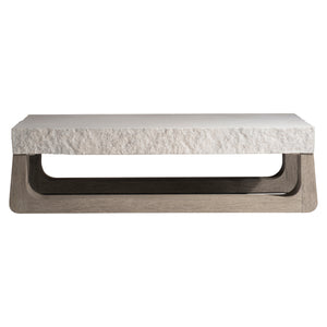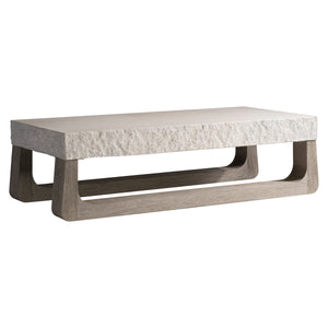 Cocktail table top of glass-reinforced concrete (GRC) with smooth top surface and textured sides, all in Sand Grey finish.Weathered Teak finish on cocktail table base of teak solids consisting of two leg bases that run parallel to each other.Ends are open.Stainless steel adjustable glides.