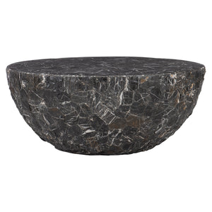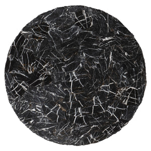 Round cocktail table of laminated Black striped stone.Smooth top and rough textured sides.Adjustable glides.