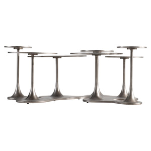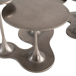 Seven small cast aluminum tables in various sizes connected to a central base.Graphite finish.Adjustable glides.