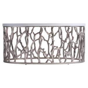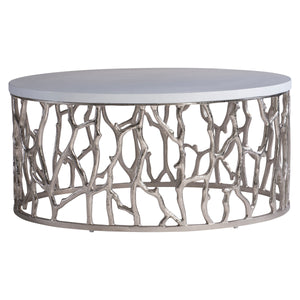 Round cocktail table.Glass-reinforced concrete (GRC) top in Bone finish.Cast aluminum faux bois open design base in Shiny Nickel finish.Stainless steel adjustable glides.