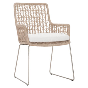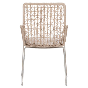 Arm chair frame of tubular Stainless steel.Frame wrapped in twisted Endura fiber in Hazelnut finish.Stainless Steel outdoor glides attach to and wrap the stretchers.