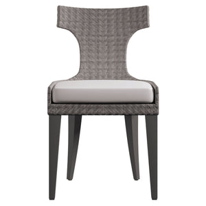 Powder-coated Aluminum legs in Graphite finish.Frame wrapped in PE herringbone flat wicker weave in finish Pewter Grey.Loose seat cushion with light gray tie-down 'D' ring.Glides.Engineered to meet outdoor product specifications/standards.