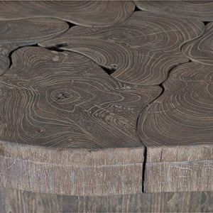Top of carbonized sliced teak in Smoked Truffle finish.Powder-coated stainless steel metal supports.Base of carbonized teak in Smoked Truffle finish.Galvanized adjustable glides.