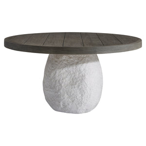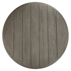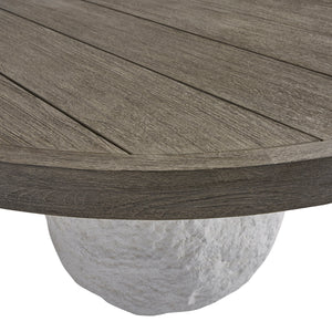 Round plank-look Teak top in Weathered Teak finish.Chiseled-look textured pedestal base of glass-reinforced concrete in rough Textured Quarry finishUneven, rounded shape on base.Stainless Steel adjustable glides.
