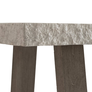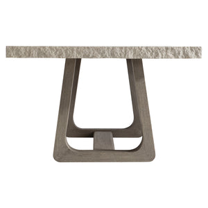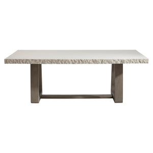 Dining table top of glass-reinforced concrete in Sand Grey finish with smooth top and textured sides.All fasteners to be Stainless Steel or galvanized.Weathered Teak finish on teak dining table base with angled 'U' shaped open ends and center stretcher at bottom.