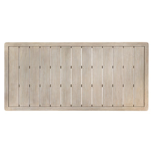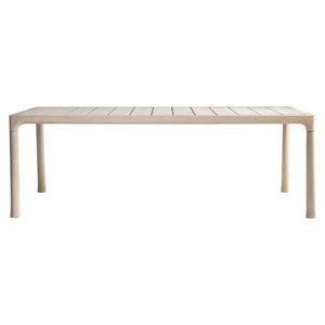 Carbonized teak in Sea Oat finishSlatted tabletop has rounded cornersStainless steel adjustable glides and fastenersTeak legs taper outward from top to bottom