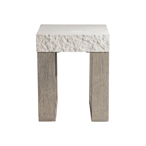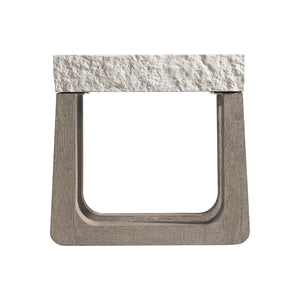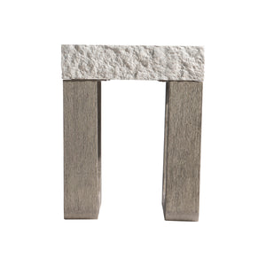 Side table top of glass-reinforced concrete (GRC).Top has smooth top surface and textured sides, all in Sand Grey finish.Weathered Teak finish on shaped side table base of teak with base consisting of two shaped support leg bases.Table is open on ends.