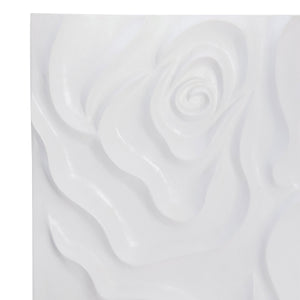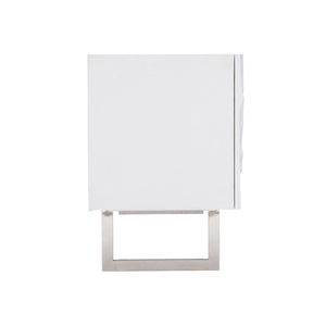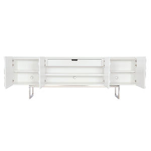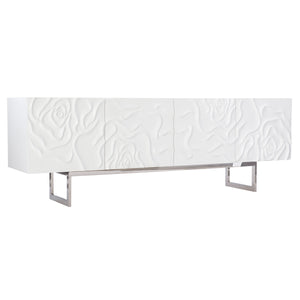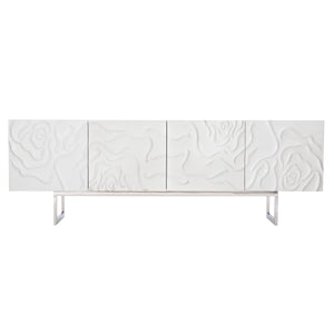 White Plaster finish. Polished stainless steel base.Four soft-closing doors with dimensional floral design fronts. Behind end doors is one adjustable/removable shelf and one grommet hole in back panel. Behind paired center doors is one adjustable/removable shelf, one drawer with hand cut-out and one grommet hole in back panel. Felt tabs behind doors.Adjustable glides.Anti-tip kit.Note: Back of case is painted white.