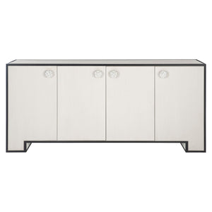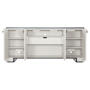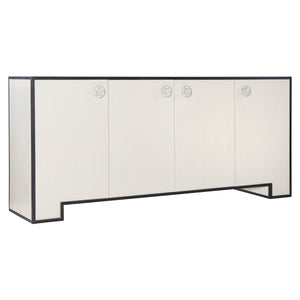 Two-tone finish - Eggshell finish on case and interior, and Onyx finish on bordersFour soft/self-closing doorsHardware pulls in plated nickel with inlay of Kabebe shellBehind LSF/RSF doors are two adjustable/removable shelves and bottom shelf surfaceBehind paired center doors is one fixed shelf, one soft-closing drawer with hand cut-out and bottom shelf surfaceLeft drawer has wrapped pad. Right drawer has silverware insertVentilation holes and one grommet hole with cover in back panelAdjustable glides. Anti-tip kitDesigned to support TV &/or other media