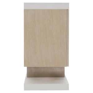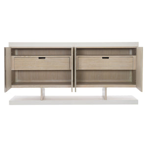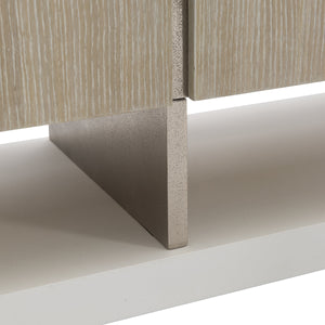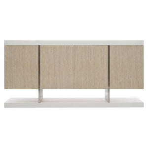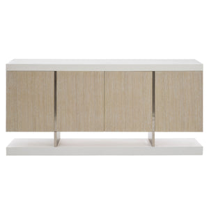 Quartered ash solids and quartered white oak veneersSideboard with top and base in Fossil finishDune finish on the balance of the wood caseFour doors - two pairs - with finger pull and with soft-close, self-close concealed hingesBehind each pair of doors are one soft-close drawer with fixed shelf surface above and below the drawerDrawer has hand pull cutoutTwo drawers per case with Brown Guardian cloth silverware insert in right drawerShiny Nickel finish on cast aluminum strip between doors and two case support panelsAdjustable glides. Anti-tip kit