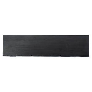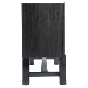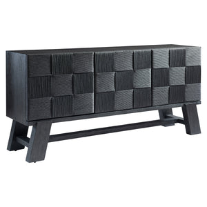 L'Ombre finish on wood sideboard with three push-to-open soft-closing concealed hinge doors, and center stretcher at bottom. Doors are wrapped in woven rope in L'Ombre finish with alternating square pattern.Behind each left and right door is one adjustable/removable shelf. Behind the center door is an open area above a fixed shelf surface, with one soft-close drawer beneath with hand-pull cutout and Guardian cloth wrapped pad in drawer.Open area beneath drawer.Adjustable glide.Anti-tip kit and instruction sheet.