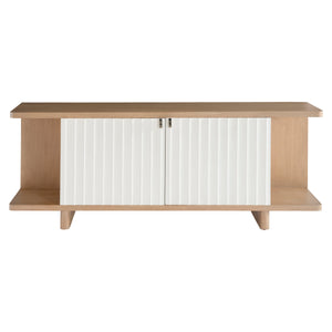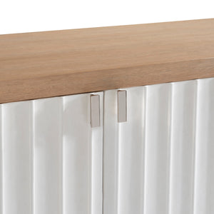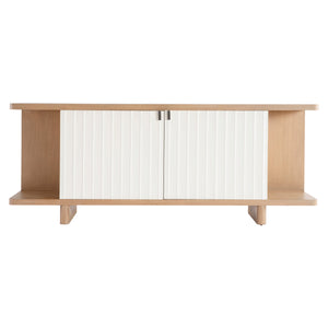 Sideboard with two concealed hinge soft-closing doors with PU cast resin fluted door fronts. All surfaces of doors are finished in Adobe finish.Behind each door is one center soft-close drawer with hand-pull cutout, with a fixed shelf surface above, and a compartment above and below the shelf. Brown Guardian cloth wrapped pad in left drawer and silverware insert in right drawer.Sahara finish on balance of case including ends and leg panels.Adjustable glides.Anti-tip kit and instruction sheet included.