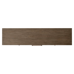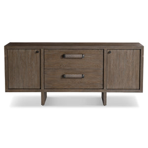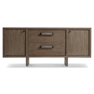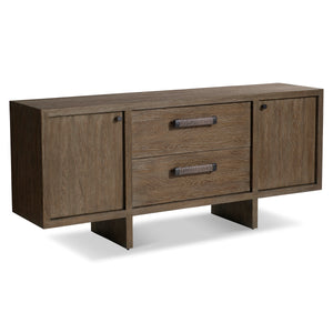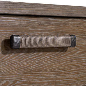 White oak solids & veneers in Playa finishTwo soft-close doors on either end and two soft-close drawers in centerMetal door and drawer pulls in Anthracite finishDrawer pulls wrapped in woven ropeBehind each door is one adjustable/removable shelf