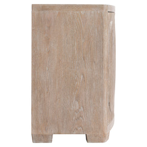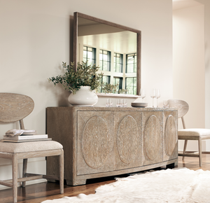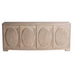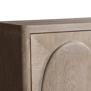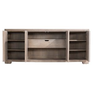 Cathedral-cut white oak solids & veneers in Marcona finishFour push-to-open, soft-close doors: paired center doors and a single door on each endBehind the far left and right doors are two adjustable/removable shelvesBehind the center doors are one fixed shelf, one soft-close drawer with hand-pull cutout and brown Guardian cloth silverware insert, and space above and belowAdjustable glides & Anti-tip kit