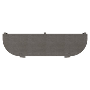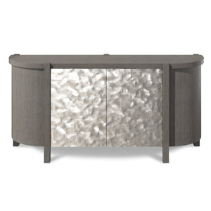 Ash wood solids and quartered oak veneer in Porcini finish with textured cast aluminum center doors in Bright Graphite finishFour concealed-hinge, push-to-open doors: one curved door on each end and two center doorsBehind curved end doors are two curved adjustable/removable shelvesBehind the paired center doors are a fixed center shelf with one soft-close drawer beneath with hand-pull cut out and a brown Guardian cloth wrapped padFive legs and one center support leg in Porcini finish; Adjustable glides & Anti-tip kit