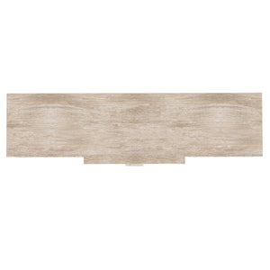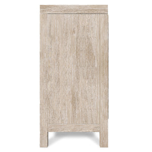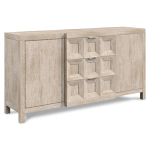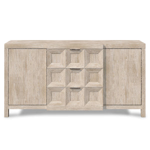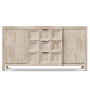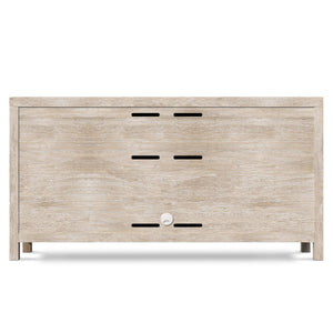 Ash solids and white oak veneers in Tawny finish with cast resin coffered design on center drawers and inset metal frame in Bright Graphite finish around doorsTwo push-to-open, concealed-hinge doors and three soft-close center drawers with metal pulls in Bright Graphite finishTop drawer has a brown Guardian cloth silverware insertBehind each door are two adjustable/removable shelves