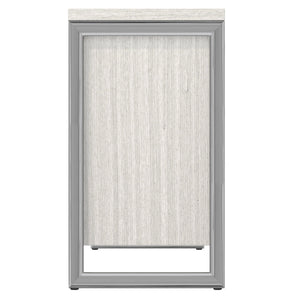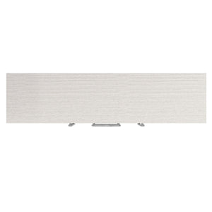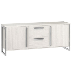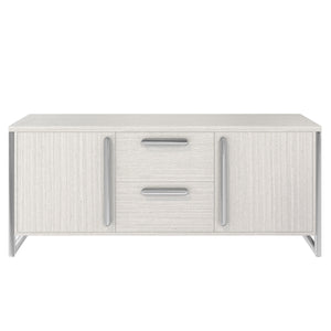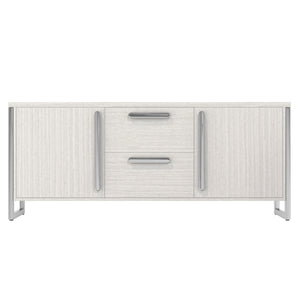 Ash solids and engineered veneer in Mist finishSteel end frames on each side in Polished Nickel finishOne soft-close door on either side of two center soft-close drawersBehind each door are two adjustable/removable shelvesAdjustable glides
