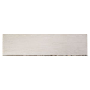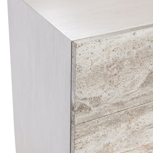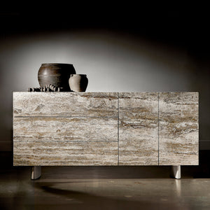 Walnut wood case in Lutra finish with silver travertine door and drawer fronts atop cast resin legs in Lutra Faux Stone finishThree push-to-open drawers with one silver insert and two wrapped padsBehind two push-to-open soft-close doors are two adjustable shelves, vents and a covered grommet holeSilver travertine fronts are cut from a single stone panel and therefore, every buffet will look differentAdjustable glides