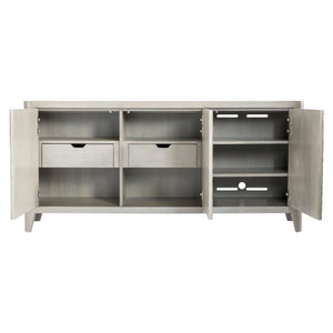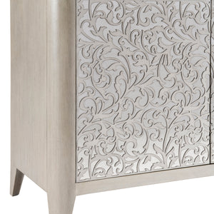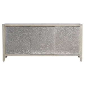 Ash wood in Nebbia finish and metal accents in Glazed Stainless Steel finishThree push-to-open doors covered in raised acanthus leaf metal friezeBehind left and center doors are two drawers with stationary shelf above and belowDrawers have one silver insert or one wrapped padBehind right door are two adjustable shelves, vents and one covered grommet