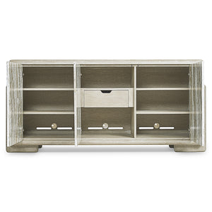 Case crafted with quartered oak solids and veneers in Clay finish with faux stone doors in Kalta finishThree push-to-open, soft-close doorsTwo adjustable shelves behind each end doorBehind center door is one pull-to-open, soft-close drawer with silverware insertThree covered grommets and vents