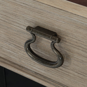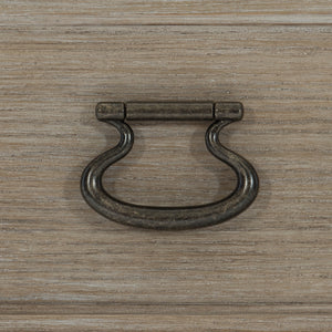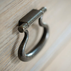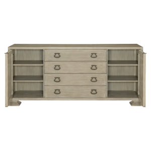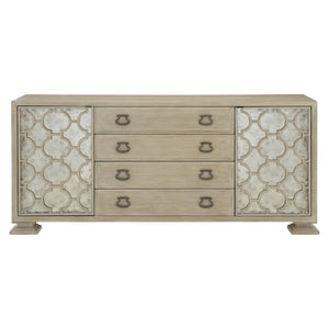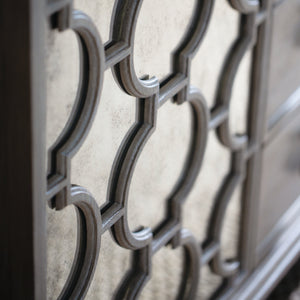Two doors with patterned cast grilles over antique glass door front and magnetic catch. Behind each each door are two adjustable/removable shelves and one fixed bottom shelf surface.Four drawers. Top drawer has silverware insert. Second drawer has wrapped pad.Turned foot. Center support leg.Adjustable glides.Anti-tip kit.