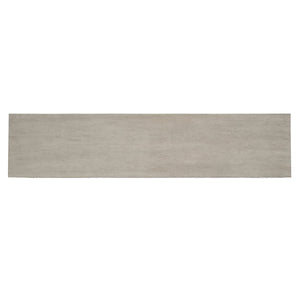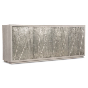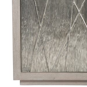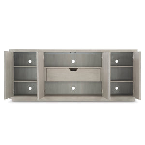 Sandblasted oak veneers in Weathered Greige finishFour touch latch doors with cast aluminum textured overlays on fronts in Graphite finishBehind end doors are two adjustable/removable shelves and two grommets with cover in back panelBehind paired center doors is one fixed shelf, one drawer with hand cut-out, two storage compartments and one bottom shelf surfaceTwo grommets with cover in back panel