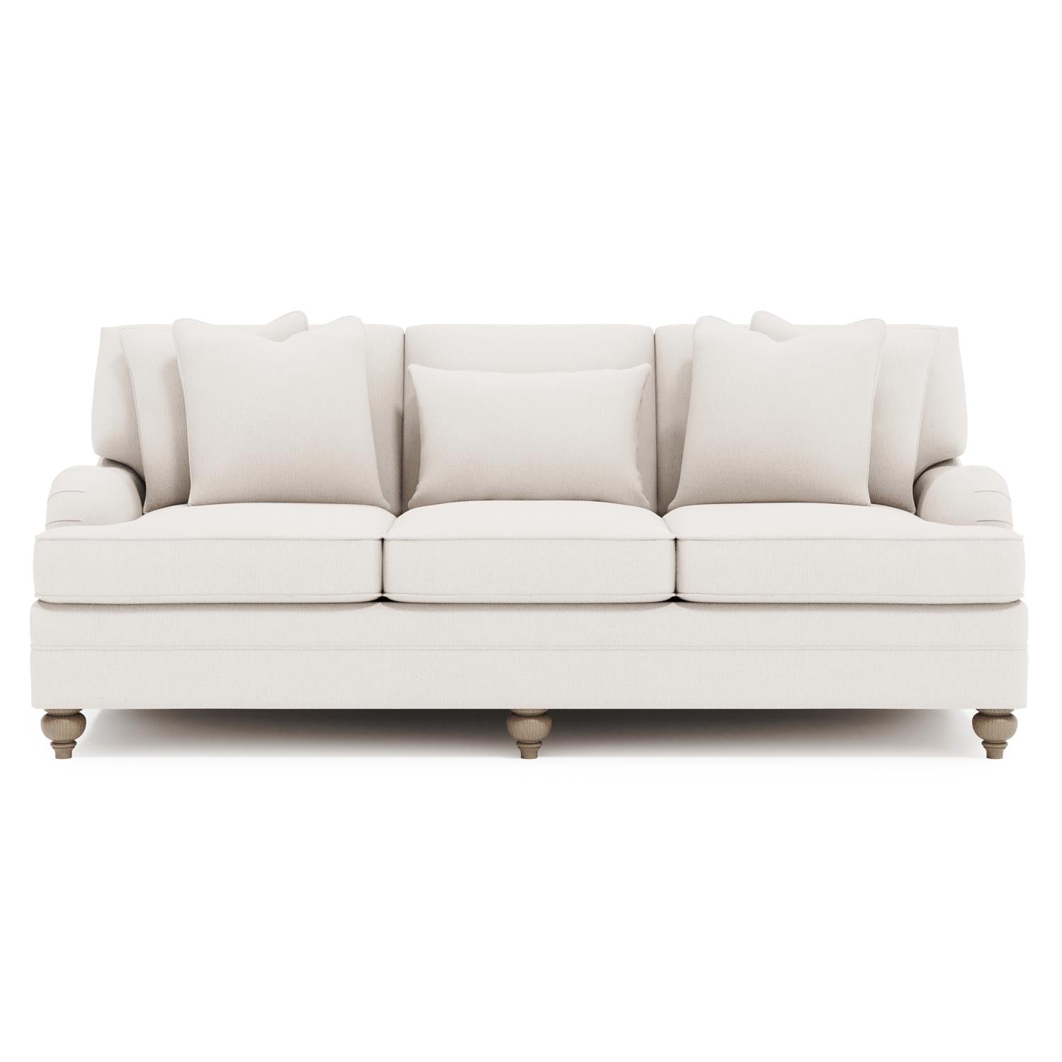 A modern version of the English rolled arm sofa, the Tarleton sofa combines graceful curves, an angled back and an extra-long seat to create an iconic shape. Refined details like pleating across the low rolled arms exemplify quality craftsmanship. The turned wooden feet establish elegance from the floor up.