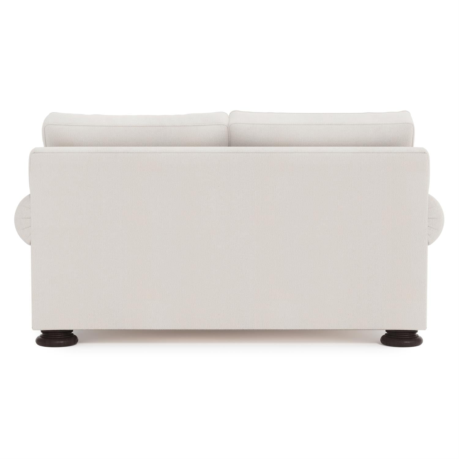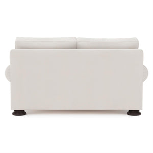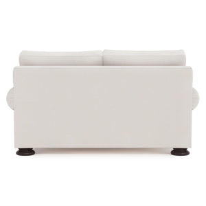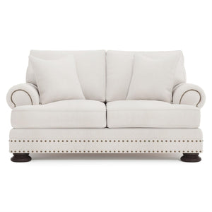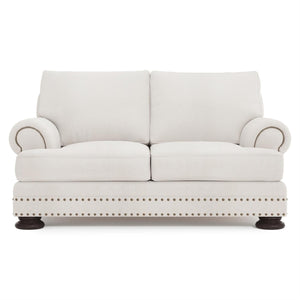 The stately Foster loveseat offers comfortable support with an air of traditional grandeur. The plush cushions invite relaxation, while rolled arms, nailhead trim, and wide bun feet exude refinement. Throw pillows complement the sofa and surrounding decor.