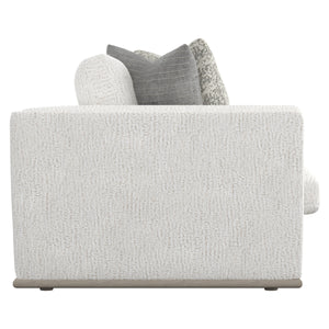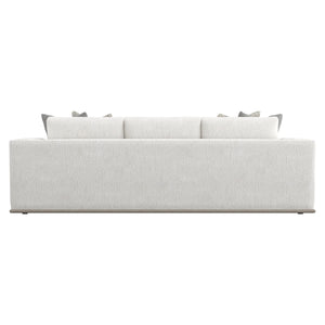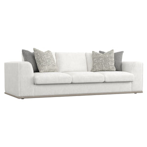 Luxurious and chic, the Prague sofa has a wide, low-profile frame that achieves a grounded, modern look. Sumptuous spring down cushions and fiber back pillows offer enduring comfort. At the base, an exposed wood band draws attention to the clean, linear design of this elegant piece.