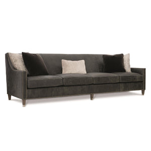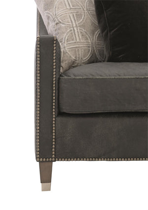 Exposed wood feet in Mocha finish with metal ferrules.Nailhead trim on arms and bottom of the seat.Features five throw pillows.Tight back and cushioned seat.